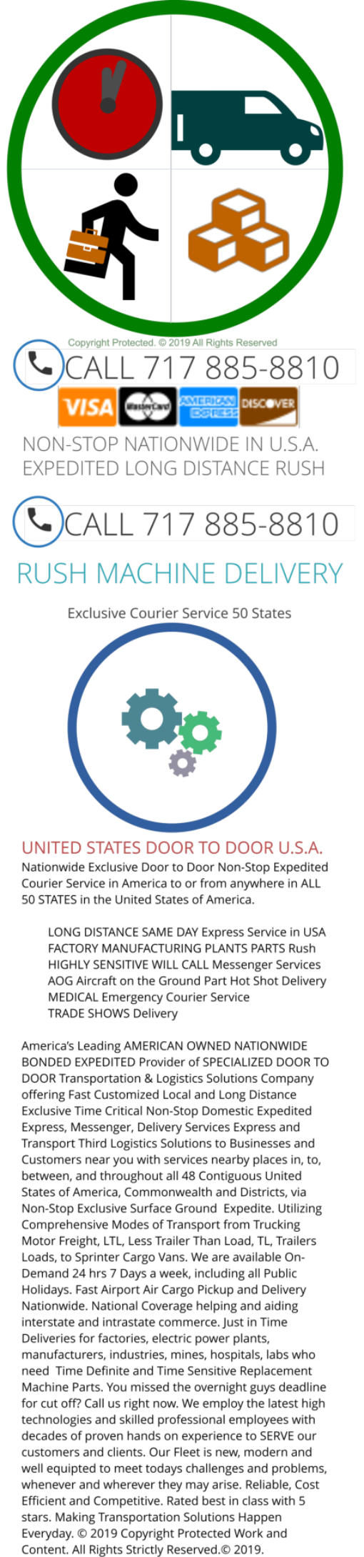 SAME·DAY·DELIVERY·SERVICE·ND·SAME·DAY·DELIVERY·SERVICE·NE·SAME·DAY·DELIVERY·SERVICE·NH·SAME·DAY·DELIVERY·SERVICE·NJ·SAME·DAY·DELIVERY·SERVICE·NM·SAME·DAY·DELIVERY·SERVICE·NV·SAME·DAY·DELIVERY·SERVICE·NY·SAME·DAY·DELIVERY·SERVICE·OH·SAME·DAY·DELIVERY·SERVICE·OK·SAME·DAY·DELIVERY·SERVICE·OR·SAME·DAY·DELIVERY·SERVICE·PA·SAME·DAY·DELIVERY·SERVICE·RI·SAME·DAY·DELIVERY·SERVICE·SC·SAME·DAY·DELIVERY·SERVICE·SD·SAME·DAY·DELIVERY·SERVICE·TN·SAME·DAY·DELIVERY·SERVICE·NYC·SAME·DAY·DELIVERY·SERVICE·TX·SAME·DAY·DELIVERY·SERVICE·UT· SAME·DAY·DELIVERY·SERVICE·VA·SAME·DAY·DELIVERY·SERVICE·VT·SAME·DAY·DELIVERY·SERVICE·WA·SAME·DAY·DELIVERY·SERVICE·WI·SAME·DAY·DELIVERY·SERVICE·WV·SAME·DAY·DELIVERY·SERVICE·WY·HIGHLY RECOMMENDED EDITOR'S CHOICE for LOCAL AND LONG DISTANCE 24 HOURS CRITICAL EXPEDITED COURIER MESSENGER DELIVERY and LOGISTICS TRANSPORTATION SOLUTIONS SERVICE COMPANY SPECIALIZING in EXPEDITED NATIONAL NATIONWIDE BONDED RUSH TIME CRITICAL· TIME SENSITIVE EMERGENCY DELIVERIES VIA EXCLUSIVE NON-STOP SURFACE - GROUND EXPEDITE. LESS THAN TRAILER LOADS ( LTL ) AND TRAILER LOAD ( TL ) EXPRESS WHETHER LOCAL OR LONG DISTANCE THROUGHOUT ALL 48 LOWER STATES OF THE UNITED STATES OF AMERICA ( USA ). WE ARE OPEN 24 HOURS FOR YOUR CONVENIENCE. CALL NOW RIGHT AND BOOK AHEAD· PLAN AHEAD AND STAY AHEAD OF YOUR COMPETITORS. FOR YOUR INFORMATION WE NOW OFFER A RANGE OF WHITE GLOVES SERVICE FOR HIGHLY SENSITIVE ORIGINAL DOCUMENTS· SECURITIES· STOCKS· BONDS· TREASURIES· PRECIOUS METALS· STONES· GEMS· JEWELLERY· COMMODITIES· RARE AND FINE ART WORKS SUCH AS ONE OF KIND ORIGINAL PAINTINGS ETC. We currently serve businesses and companies in industry· finance· manufacturing· power generation· high technology· communciations· trade shows· Healthcare· Life Sciences· Pharmaceutical· Automotive· Aerospace· Aviation· Research· Construction· Intermodal· Telecom· Fire Equipment· conventions· mining· drilling· gas fracking· network parts· dentistry· dental components· printing· architectural drawings· bids· grants· proposals. We are same day experts and specialists who are here to meet and exceed your crisis emergency delivery and courier service needs with varied transportation modes at our disposal throughout the United States of America. See and read customer reviews and comments. see what people are saying about us. Parcel service is now rolling out in all 48 continental contiguous states. bids· grants· proposals· aircraft automotive manufacturing components bearings motor freight electrical power plants critical parts courier service SAMEDAY RUSH Open Today now 24 Hours Sun Mon Tue Wed Thurs Fri Sat Sun Public Holidays BEST COURIER SERVICE IN TO FROM NEARBY NEAR indepence· ks | state college· pa | duncannon· pa | new buffalo· pa | halifax· pa | conshohocken· pa | baltimore·md | washington· dc· dc | swedesboro· nj | boston· ma | bordentown· pa | clearfield· pa | dubois· pa | oil city· pa | sugar notch· pa hanover· pa | batavia· ny | mount wolf· ny | rochester· ny | essington· vt | essex junction· vt | woonsocket· nh | grenwich· ri | providence· ri | framingham· ma | Harrisburg· PA | Carlisle· PA | lebanon· pa | jonestown· pa | halifax· pa | tower city· pa | pine grove· pa | palmyra· pa | hershey· pa | bethel· pa | frystown· pa | myerstown· pa | swedesboro· nj | wilmingotn· de | philadelphia· pa | allentown· pa | bethlehem· pa | colonial heights· va | colonial park· pa | union· nj | toledo· oh | lehigh valley· pa | reston· va | lake george· ny· lake placid· ny | corning· ny | malta· ny | greenwich· ct | stamford· ct | mt kisco· ny | purchase· ny | port chester· ny | elmsford· ny | colonial heights· va | frederick· md | mannassas· va | falls church· va | sterling va | roanoke· va | blacksburg· va | dover· de | newark· nj | poughkeepsie· ny | kingston· pa | forty fort· pa | plains· pa | white plains· ny | westchester· ny | port chetser· ny | rye· ny | purchase· ny | emlmsford· ny | tarrytown· ny | sleepy hollow· pa | tappan· nj | mahwah· nj | newburgh· ny | binghamton· ny | levittown· pa | yorktown heights· ny | southbury· ct | new york· ny· nyc· nys | york· pa | new rochelle· ny | yonkers· ny | greensboro· nc | raleigh· nc | durham· nc | springfield· il | chicago· il | wilmington· nc | lehighton· pa | White Plains· NY | Piermont· NY | Pearl river· NY | orange· nj | ewing·