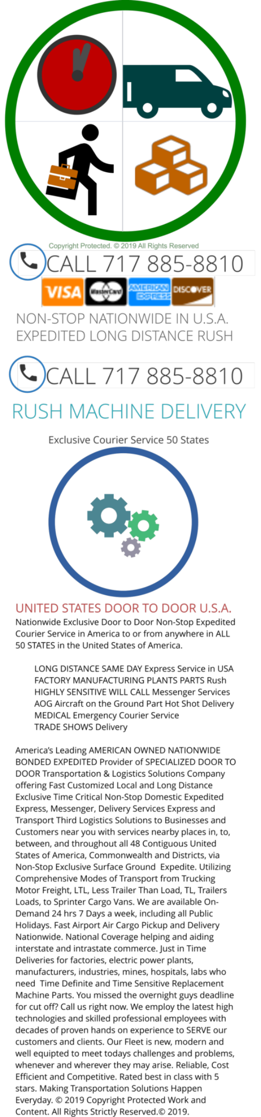 SAME·DAY·DELIVERY·SERVICE·ND·SAME·DAY·DELIVERY·SERVICE·NE·SAME·DAY·DELIVERY·SERVICE·NH·SAME·DAY·DELIVERY·SERVICE·NJ·SAME·DAY·DELIVERY·SERVICE·NM·SAME·DAY·DELIVERY·SERVICE·NV·SAME·DAY·DELIVERY·SERVICE·NY·SAME·DAY·DELIVERY·SERVICE·OH·SAME·DAY·DELIVERY·SERVICE·OK·SAME·DAY·DELIVERY·SERVICE·OR·SAME·DAY·DELIVERY·SERVICE·PA·SAME·DAY·DELIVERY·SERVICE·RI·SAME·DAY·DELIVERY·SERVICE·SC·SAME·DAY·DELIVERY·SERVICE·SD·SAME·DAY·DELIVERY·SERVICE·TN·SAME·DAY·DELIVERY·SERVICE·NYC·SAME·DAY·DELIVERY·SERVICE·TX·SAME·DAY·DELIVERY·SERVICE·UT· SAME·DAY·DELIVERY·SERVICE·VA·SAME·DAY·DELIVERY·SERVICE·VT·SAME·DAY·DELIVERY·SERVICE·WA·SAME·DAY·DELIVERY·SERVICE·WI·SAME·DAY·DELIVERY·SERVICE·WV·SAME·DAY·DELIVERY·SERVICE·WY·HIGHLY RECOMMENDED EDITOR'S CHOICE for LOCAL AND LONG DISTANCE 24 HOURS CRITICAL EXPEDITED COURIER MESSENGER DELIVERY and LOGISTICS TRANSPORTATION SOLUTIONS SERVICE COMPANY SPECIALIZING in EXPEDITED NATIONAL NATIONWIDE BONDED RUSH TIME CRITICAL· TIME SENSITIVE EMERGENCY DELIVERIES VIA EXCLUSIVE NON-STOP SURFACE - GROUND EXPEDITE. LESS THAN TRAILER LOADS ( LTL ) AND TRAILER LOAD ( TL ) EXPRESS WHETHER LOCAL OR LONG DISTANCE THROUGHOUT ALL 48 LOWER STATES OF THE UNITED STATES OF AMERICA ( USA ). WE ARE OPEN 24 HOURS FOR YOUR CONVENIENCE. CALL NOW RIGHT AND BOOK AHEAD· PLAN AHEAD AND STAY AHEAD OF YOUR COMPETITORS. FOR YOUR INFORMATION WE NOW OFFER A RANGE OF WHITE GLOVES SERVICE FOR HIGHLY SENSITIVE ORIGINAL DOCUMENTS· SECURITIES· STOCKS· BONDS· TREASURIES· PRECIOUS METALS· STONES· GEMS· JEWELLERY· COMMODITIES· RARE AND FINE ART WORKS SUCH AS ONE OF KIND ORIGINAL PAINTINGS ETC. We currently serve businesses and companies in industry· finance· manufacturing· power generation· high technology· communciations· trade shows· Healthcare· Life Sciences· Pharmaceutical· Automotive· Aerospace· Aviation· Research· Construction· Intermodal· Telecom· Fire Equipment· conventions· mining· drilling· gas fracking· network parts· dentistry· dental components· printing· architectural drawings· bids· grants· proposals. We are same day experts and specialists who are here to meet and exceed your crisis emergency delivery and courier service needs with varied transportation modes at our disposal throughout the United States of America. See and read customer reviews and comments. see what people are saying about us. Parcel service is now rolling out in all 48 continental contiguous states. bids· grants· proposals· aircraft automotive manufacturing components bearings motor freight electrical power plants critical parts courier service SAMEDAY RUSH Open Today now 24 Hours Sun Mon Tue Wed Thurs Fri Sat Sun Public Holidays BEST COURIER SERVICE IN TO FROM NEARBY NEAR indepence· ks | state college· pa | duncannon· pa | new buffalo· pa | halifax· pa | conshohocken· pa | baltimore·md | washington· dc· dc | swedesboro· nj | boston· ma | bordentown· pa | clearfield· pa | dubois· pa | oil city· pa | sugar notch· pa hanover· pa | batavia· ny | mount wolf· ny | rochester· ny | essington· vt | essex junction· vt | woonsocket· nh | grenwich· ri | providence· ri | framingham· ma | Harrisburg· PA | Carlisle· PA | lebanon· pa | jonestown· pa | halifax· pa | tower city· pa | pine grove· pa | palmyra· pa | hershey· pa | bethel· pa | frystown· pa | myerstown· pa | swedesboro· nj | wilmingotn· de | philadelphia· pa | allentown· pa | bethlehem· pa | colonial heights· va | colonial park· pa | union· nj | toledo· oh | lehigh valley· pa | reston· va | lake george· ny· lake placid· ny | corning· ny | malta· ny | greenwich· ct | stamford· ct | mt kisco· ny | purchase· ny | port chester· ny | elmsford· ny | colonial heights· va | frederick· md | mannassas· va | falls church· va | sterling va | roanoke· va | blacksburg· va | dover· de | newark· nj | poughkeepsie· ny | kingston· pa | forty fort· pa | plains· pa | white plains· ny | westchester· ny | port chetser· ny | rye· ny | purchase· ny | emlmsford· ny | tarrytown· ny | sleepy hollow· pa | tappan· nj | mahwah· nj | newburgh· ny | binghamton· ny | levittown· pa | yorktown heights· ny | southbury· ct | new york· ny· nyc· nys | york· pa | new rochelle· ny | yonkers· ny | greensboro· nc | raleigh· nc | durham· nc | springfield· il | chicago· il | wilmington· nc | lehighton· pa | White Plains· NY | Piermont· NY | Pearl river· NY | orange· nj | ewing·